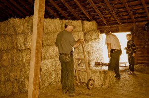 It takes the bale up into the barn door where others catch it and load it on a cart…the cart is stacked three or four high and is wheeled over to the stack to unload…another art in itself!