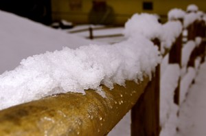 Chilly winter scenery….a frozen flower barrel with white fluffy snow growing out of it instead of summer flowers on a warm summer night.