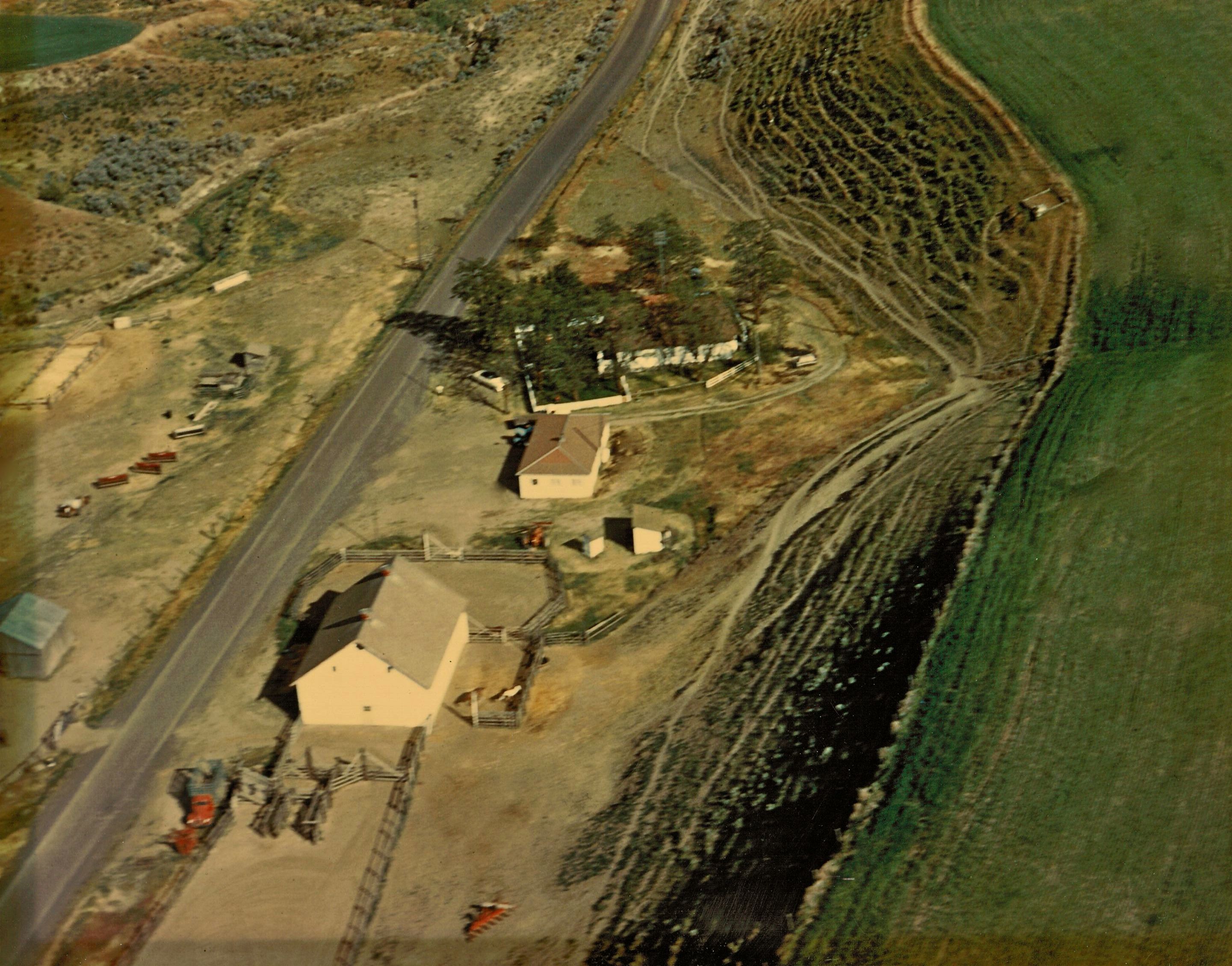 A view of our home in the early 1950’s…the house is in the middle of the trees…the white 100 plus year old barn is at the bottom with the corrals and roping arena. It has changed a bit as now we have a large shop between the house and the barn…and I have a round corral to train my horses in behind the barn.