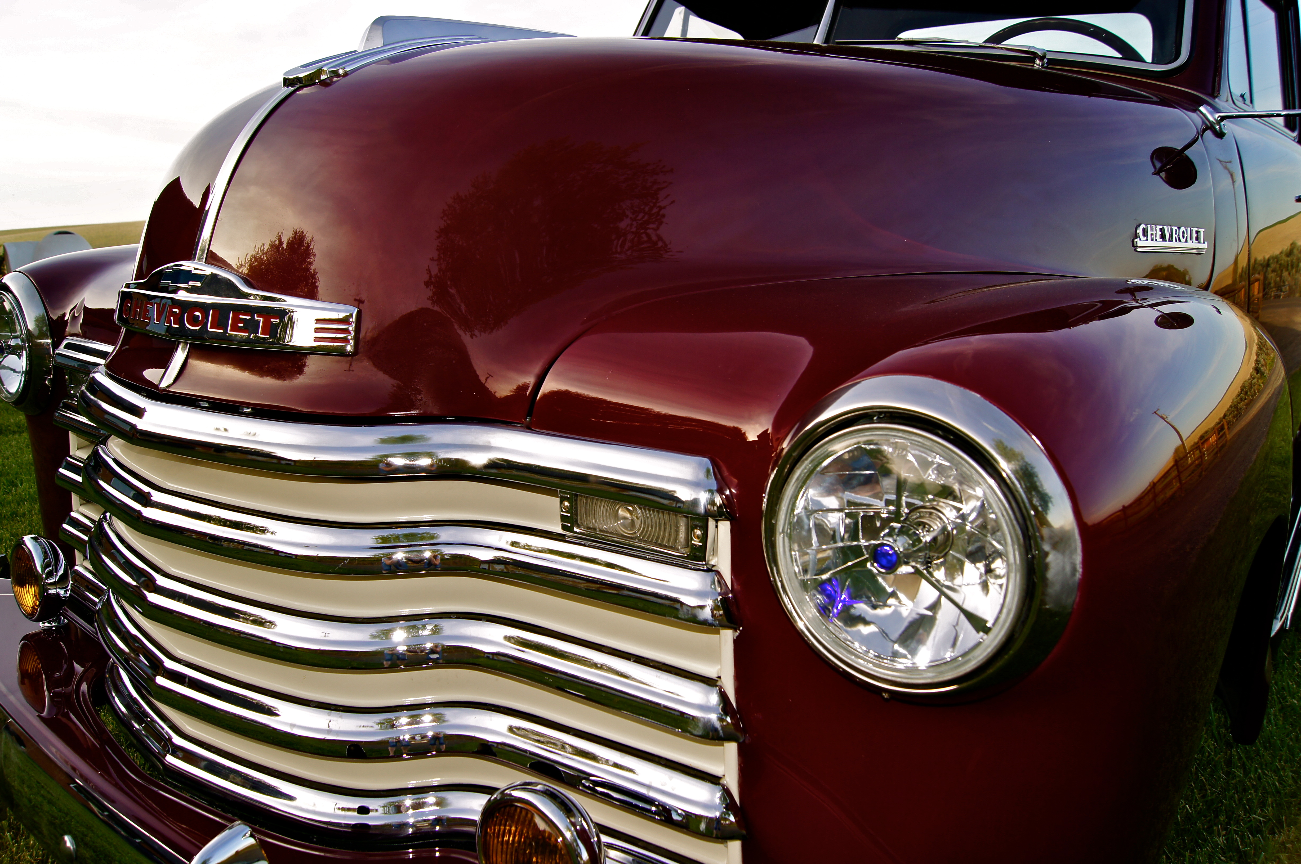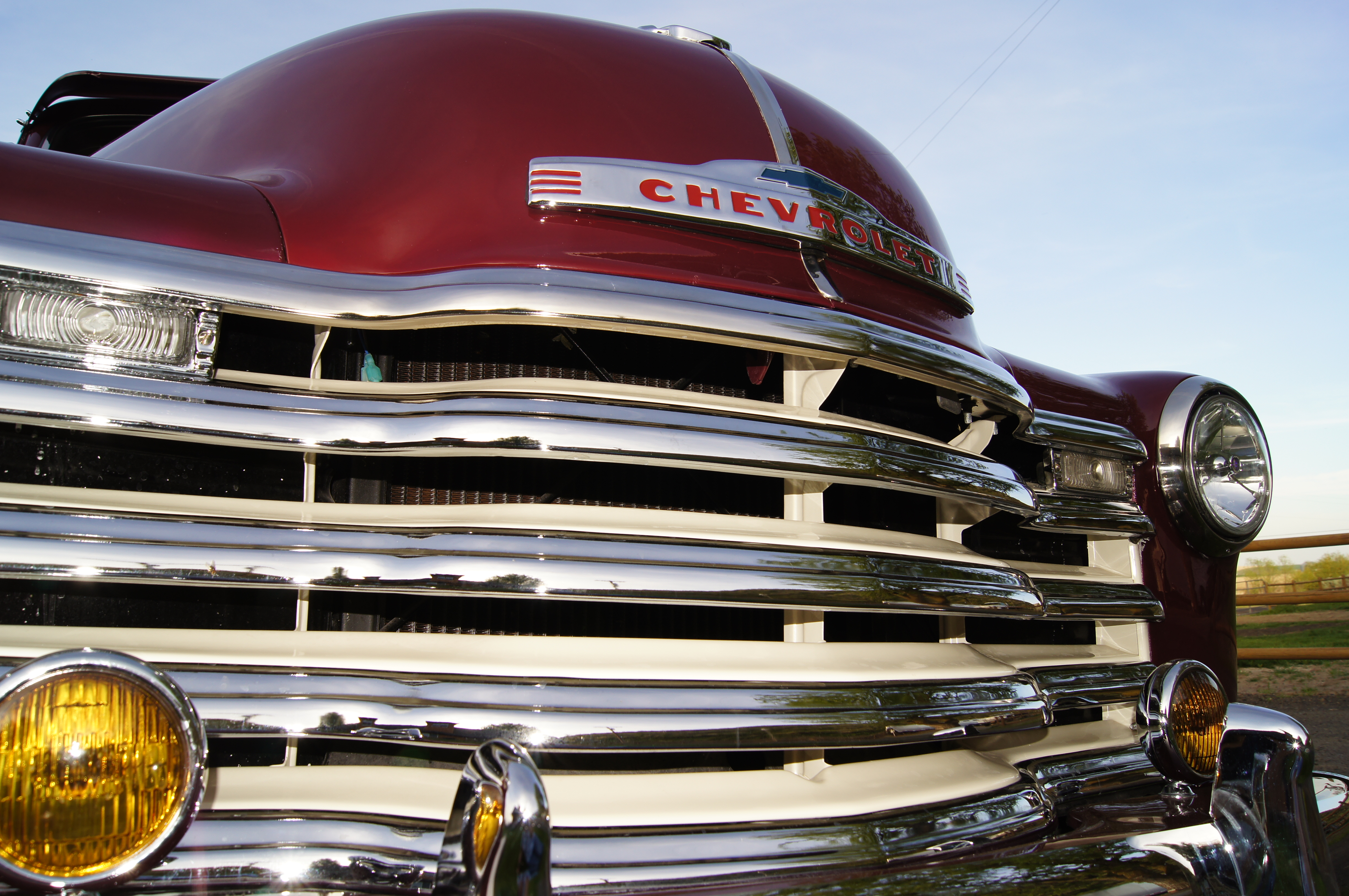 The chrome grill and rounded nose of this vintage truck rock with artistic design!