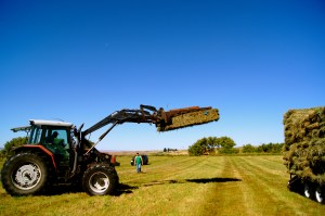 The tractor has a front end loader on it so it pick can pick up 1-4 bales at once…if you are a seasoned tractor driver you are good at loading each bale with precise perfection! It is an art as it is very important how you stack it on a trailer that will be traveling down the road.