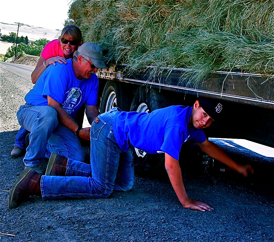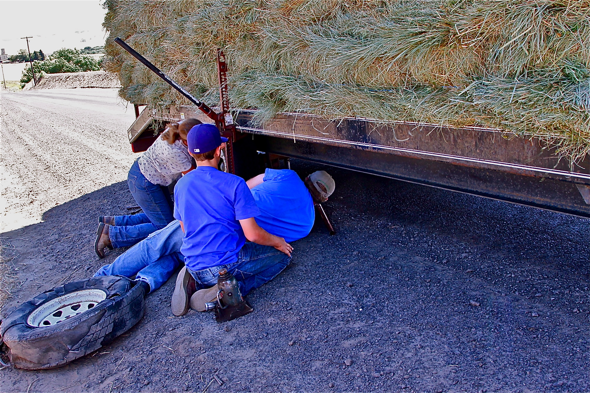 Wild Bill is getting the ropes out to begin securing the hay to the trailer as we have about 80 miles to go home…with big hills and many corners.