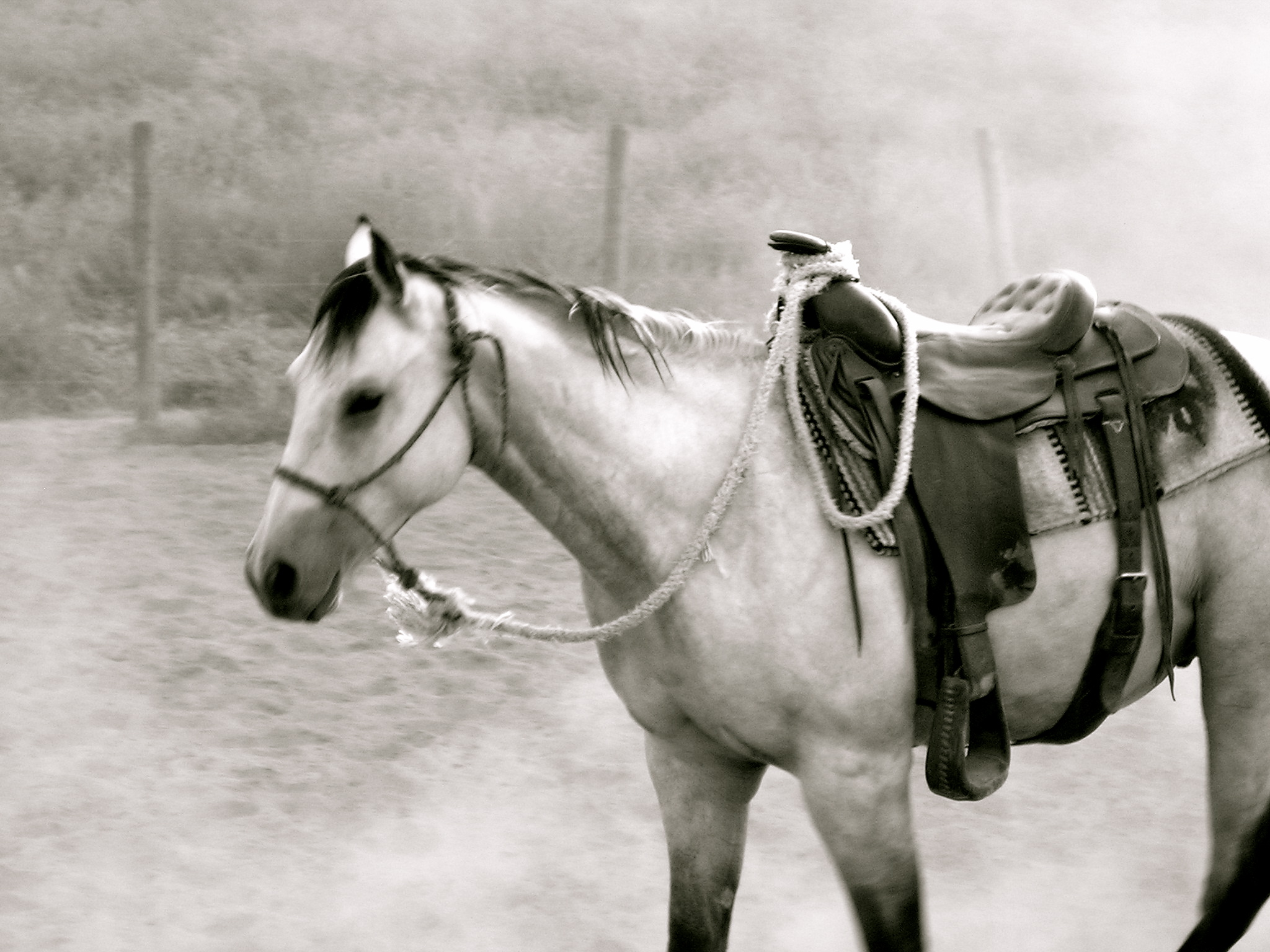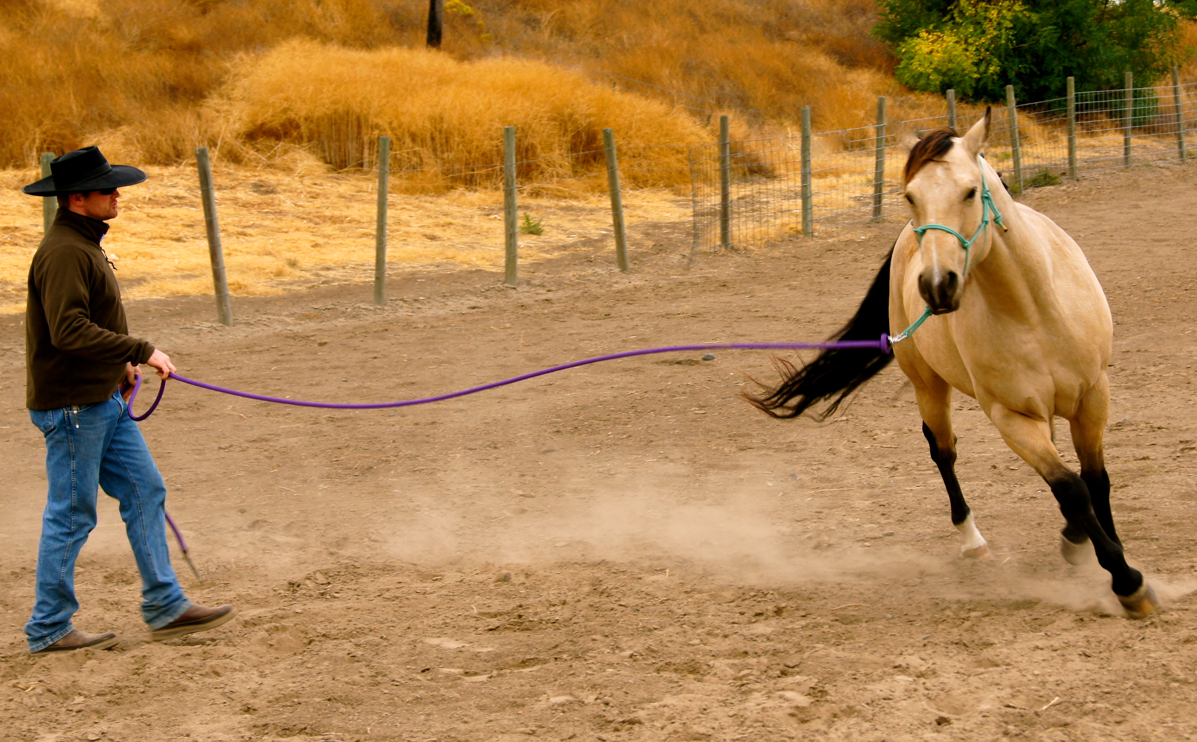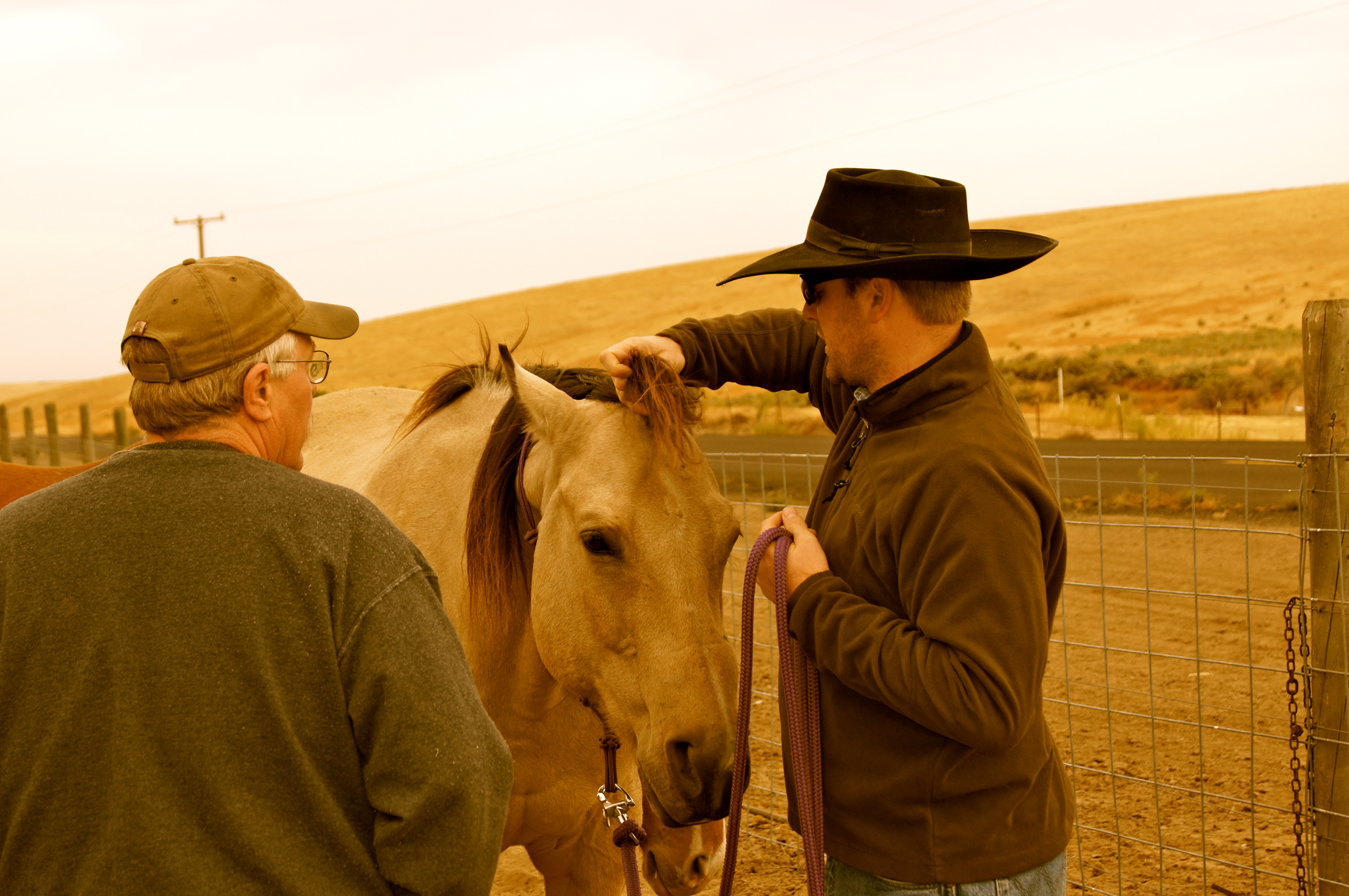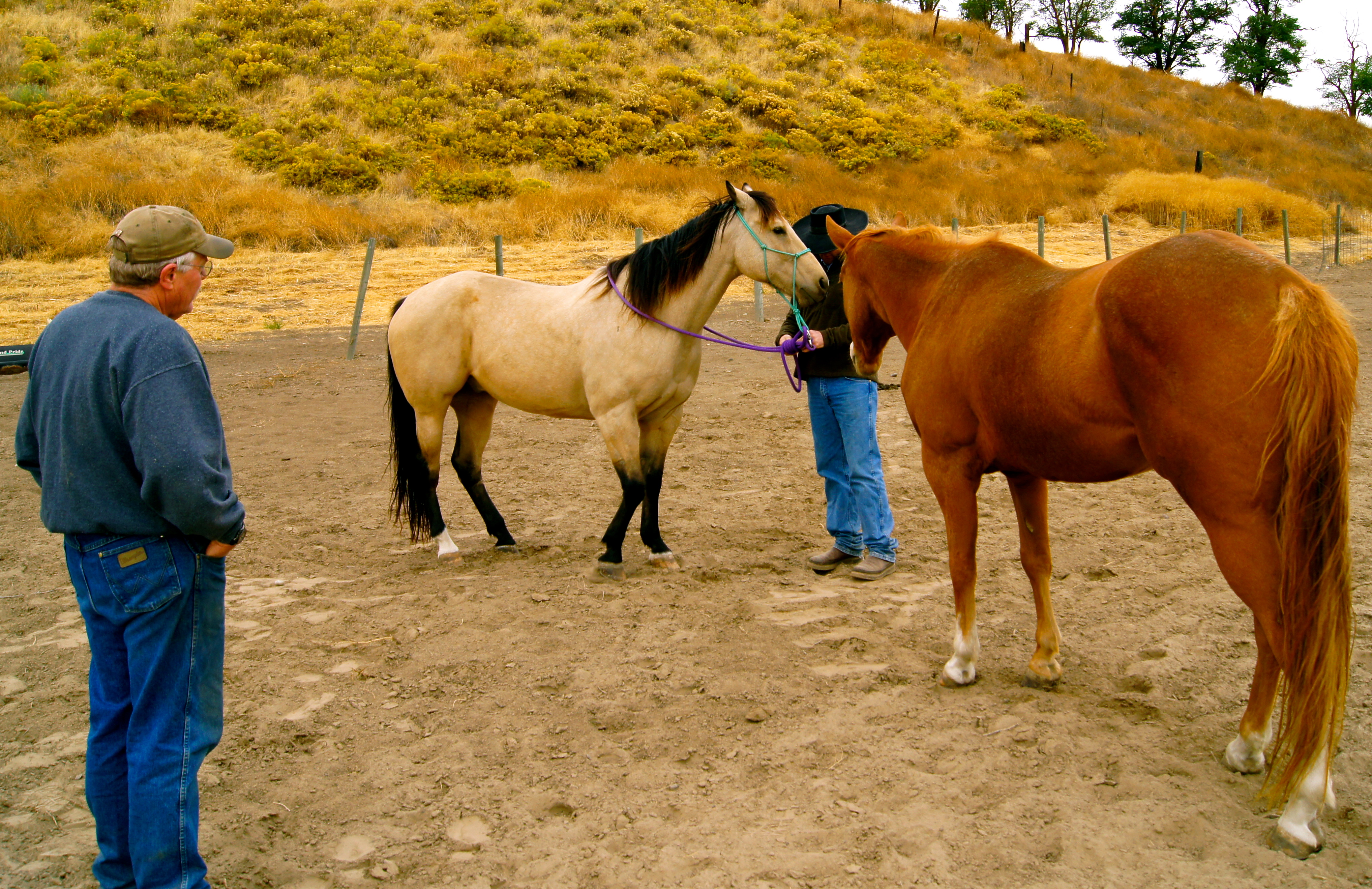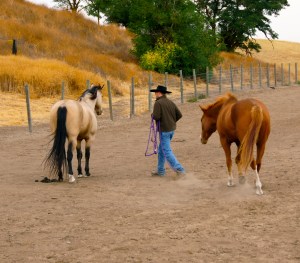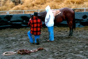 Curt is getting ready to ride bareback…making the halter lead rope into a rein…and talking to Wild Bill.