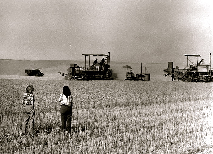 This photograph would have been in the late 1940’s or early 1950’s…pull combines pulled by tractors without cabs or air conditioning…no CB’s or communication…you had to watch the machines in order to tell where a combine was in the field…sometimes the pull combine would be down in a canyon so you could not see it…but if you listen and watch for a puff of smoke from the Caterpillar tractor pulling the machine up a hill, then you knew…truck drivers always sat on top of the hill in the field, trying to figure out where they were needed. Today’s truck drivers have the luxury of radio or cell phones…and they know where they are needed.