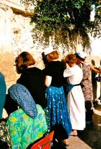 This photo was taken at the “Wailing Wall” in the Old City of Jerusalem, I am in the blue skirt and black t-shirt.