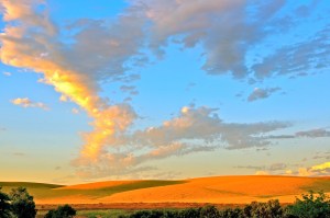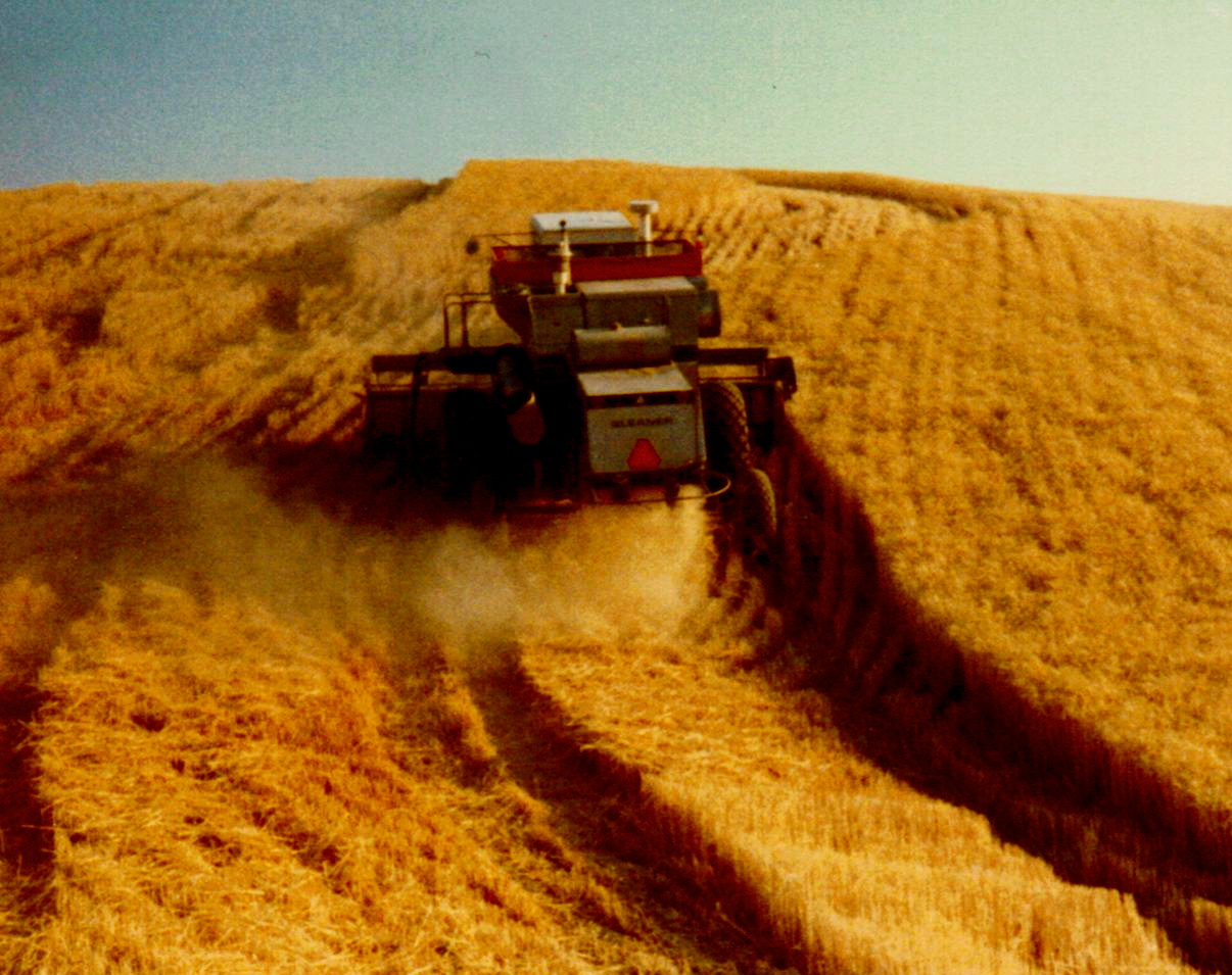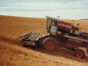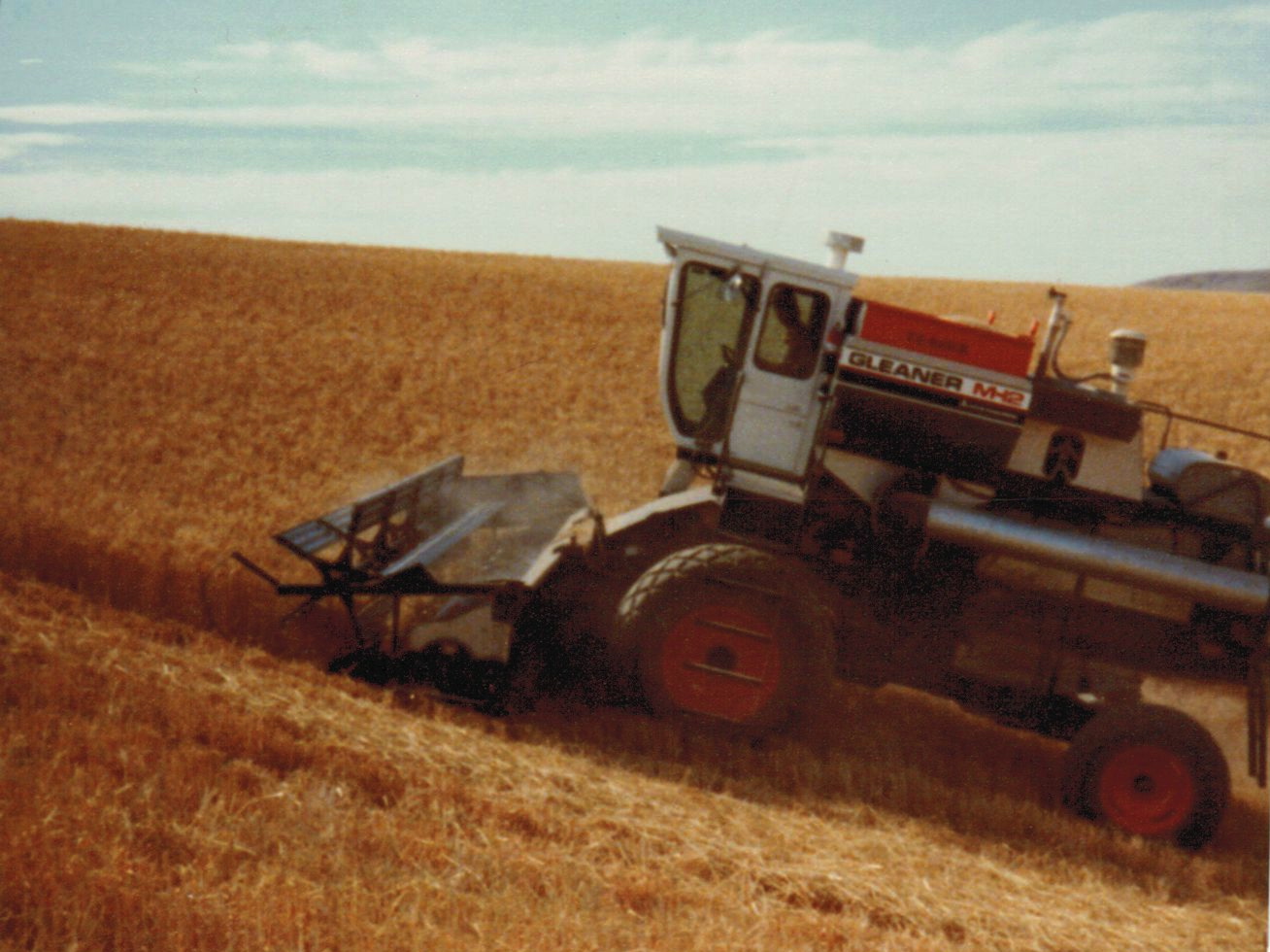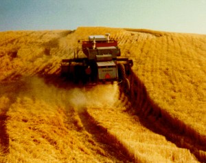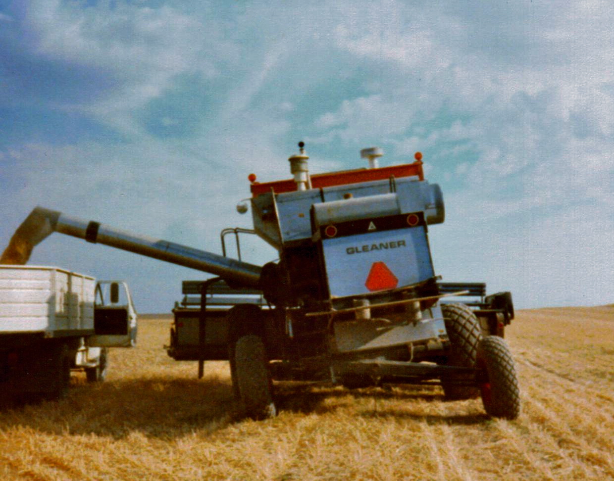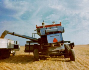 Back when WB and I farmed the land, the machines we had were considered the art of technology…20′ headers and a bulker that held 120 bushels of wheat. Here the combine is leaning as it is using the automatic leveling to unload the wheat into the back of the truck.