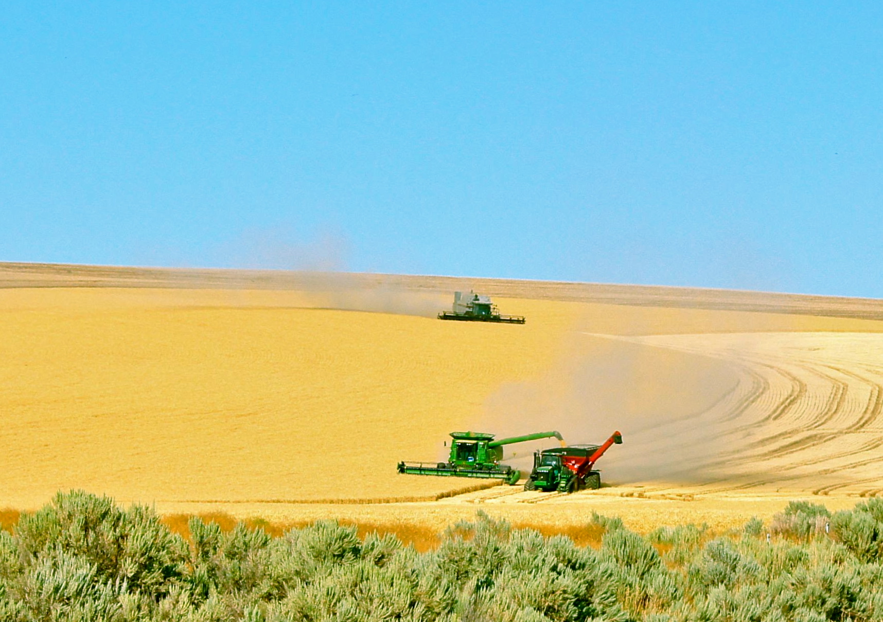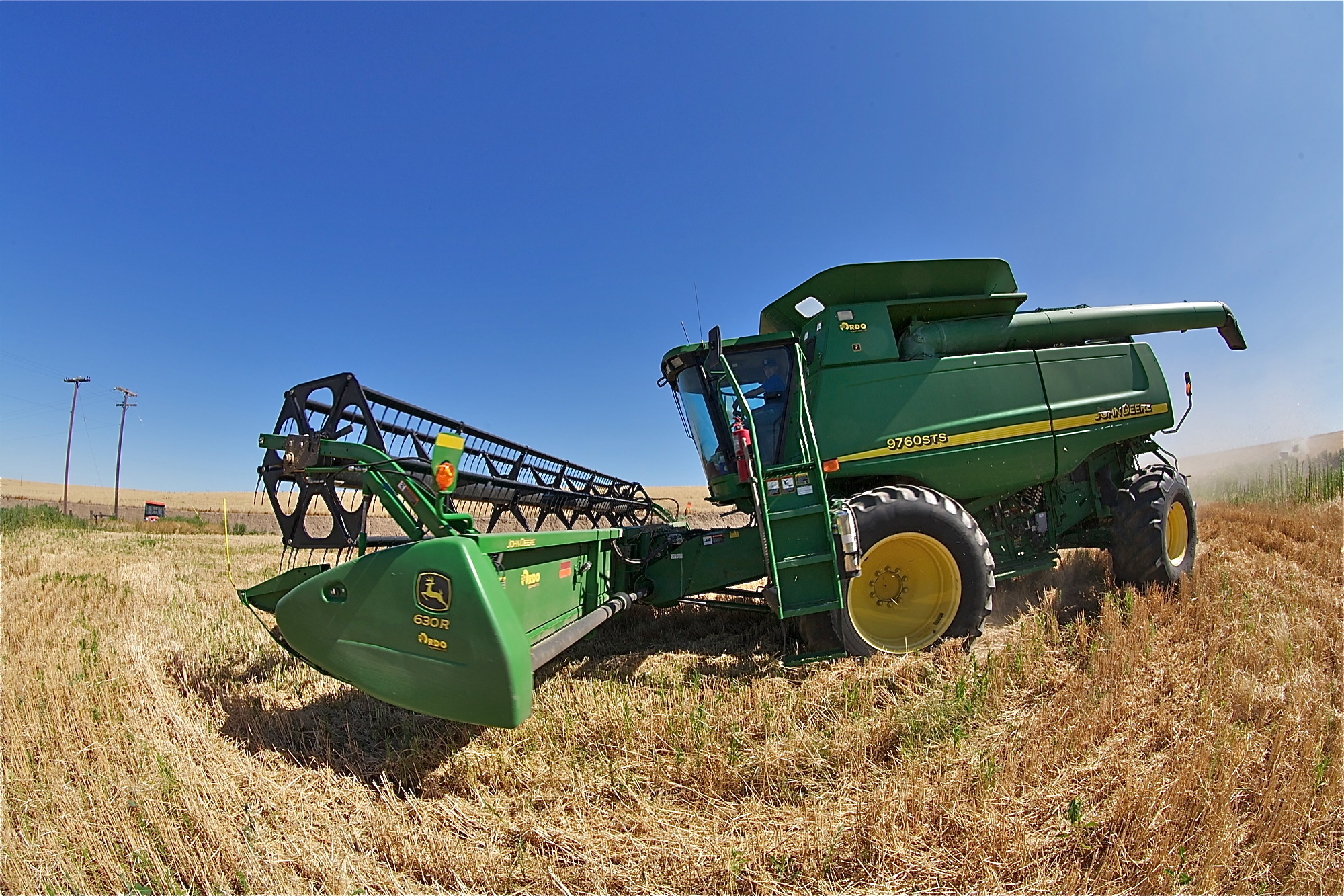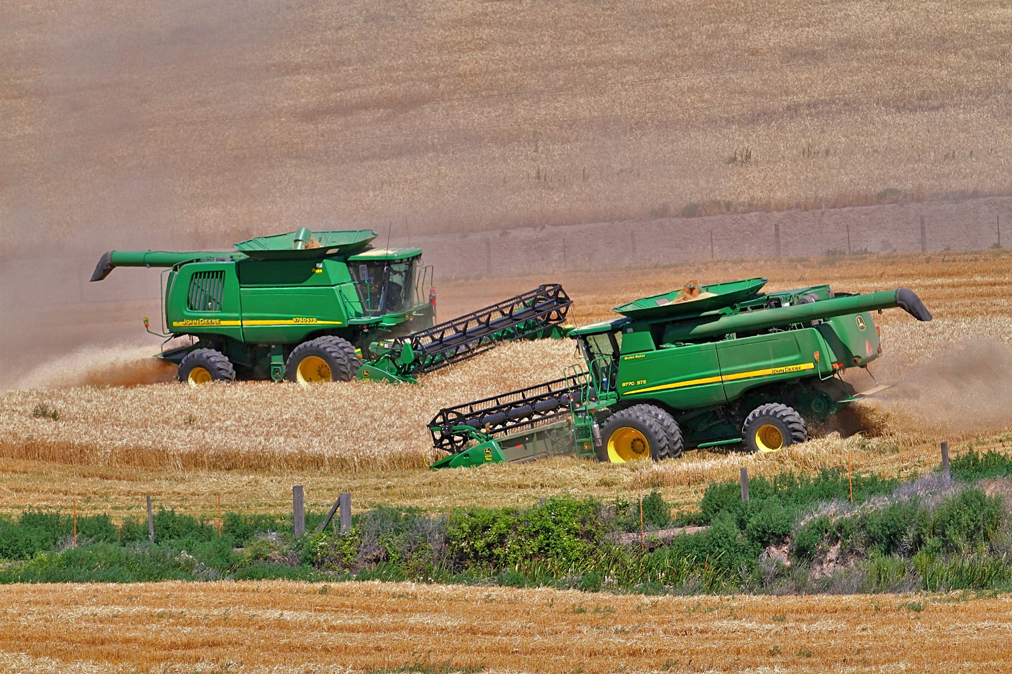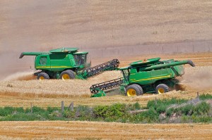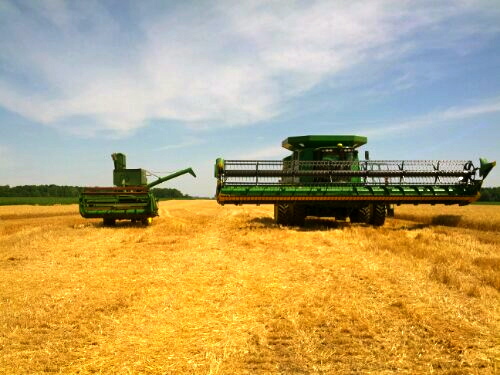 The smaller John Deere combine next to today’s machine is a 1955 model…no cab and a 10′ header compared to the 40′ header…it held 40 bushels of wheat while todays model holds 400 bushels of wheat…when I was driving truck we had one of the JD 55’s and my uncles always used it to open up fields and draws or canyons…I can not imagine the 40′ header today…WOW!