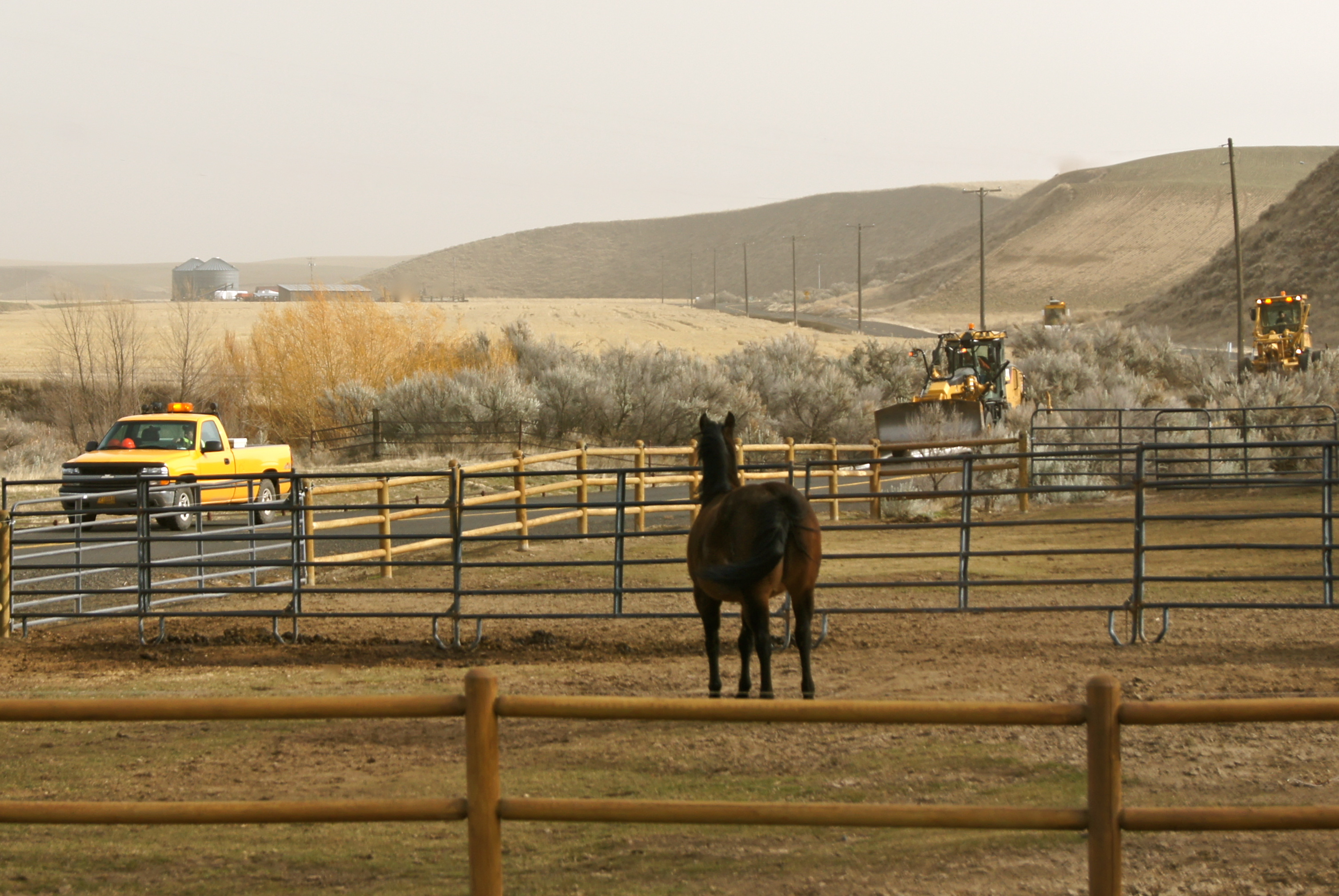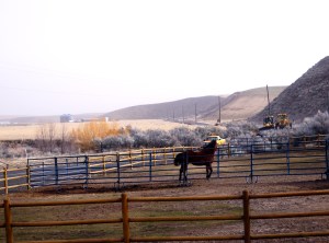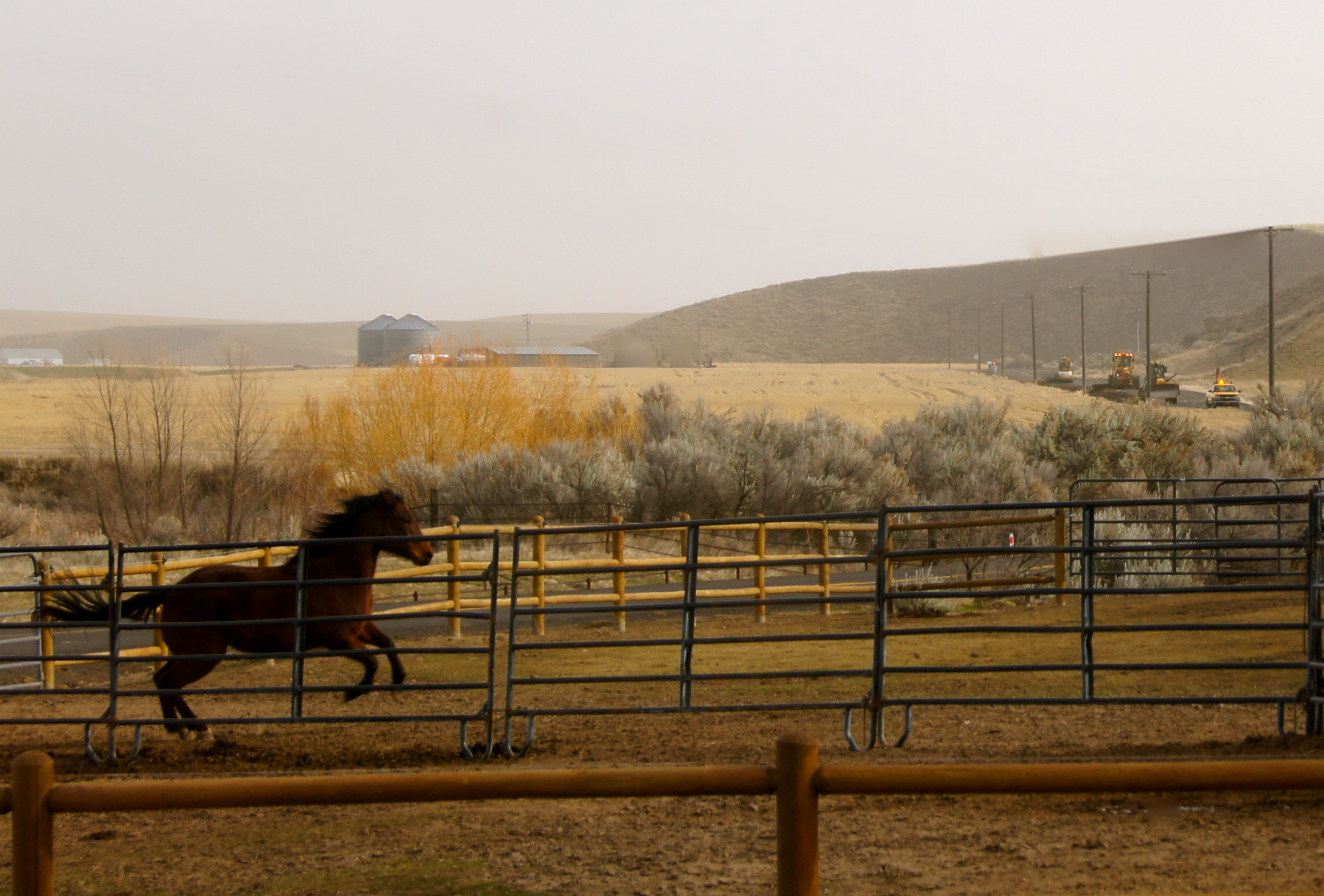 Horses are not fond of wind as they are prey animals and keep aware of their surroundings in case they have to flee for their life. When the wind blows the normal usual things they see everyday that are “safe” become unknown shapes…that is when they jump or spook. WB’s horse Buck was on guard…watching closely as the winds were whipping it up pretty good moving sagebrush and bushes that are in his pasture.