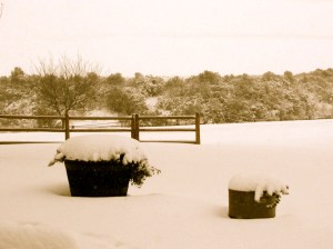 Chilly winter scenery….a frozen flower barrel with white fluffy snow growing out of it instead of summer flowers on a warm summer night.