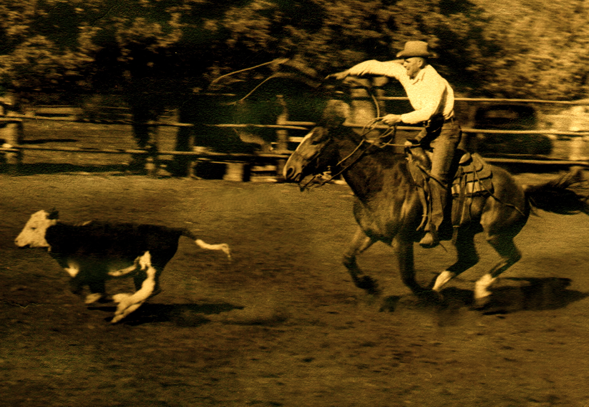 Dad and Jingle….1940’s roping here in the arena across the road. The Juniper Joust eventually became the Mustangers.